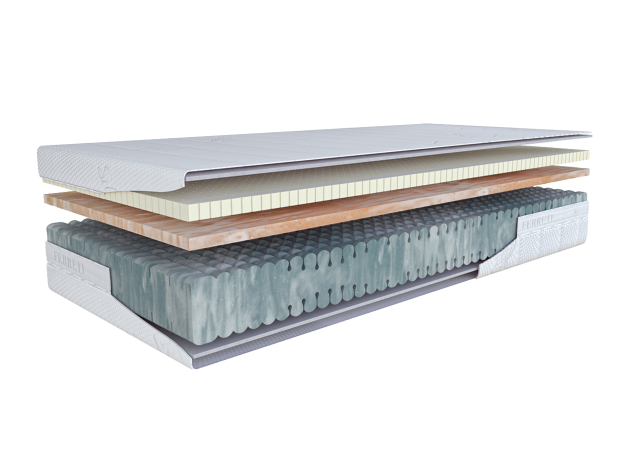 Matrac je okrem základného materiálu v jadre, ktorým je certifikovaná studená pena CELLFLEX, doplnený na povrchu jednej strany o ďalší výnimočný materiál TALALAY LATEX – jediný latex s otvorenou bunkovou štruktúrou. Talalay latex je bodovo prispôsobivý a dlhodobo elastický. Jeho elasticita, ktorá si vás získa dnes, bude nezmenená aj po dlhých rokoch užívania. Ďalšou použitou penou na prírodnom základe je výnimočný BIOGREEN, u ktorého je jeho základná výrobná zložka nahradená prírodným ricínovým olejom. Zabezpečuje pozvoľný prechod od jemného, elastického a bodovo kopírovacieho latexu do pevnejšieho jadra, potrebného pre ideálnu oporu chrbtice počas spánku.